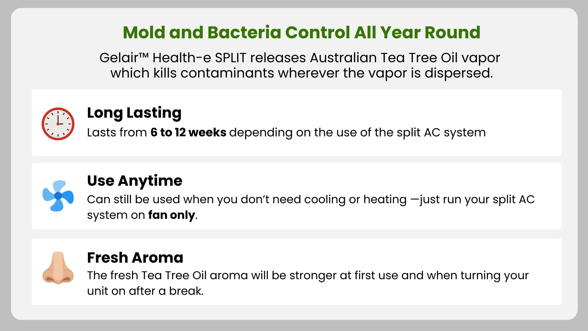 [ CLINICAL HYGIENE ] Sterilizes the entire AC system, reaching areas you can’t clean manually. [ 99.9% ELIMINATION ] Effectively stops the spread of invisible mold spores, bacteria, and viruses. [ PATENTED TECHNOLOGY ] Slow-release sachet ensures consistent protection for up to 8 weeks. [ 100% NATURAL ] Powered by the finest Australian Tea Tree Oil — no harsh chemicals, just nature’s most powerful antiseptic.🌟 KEY BENEFITS